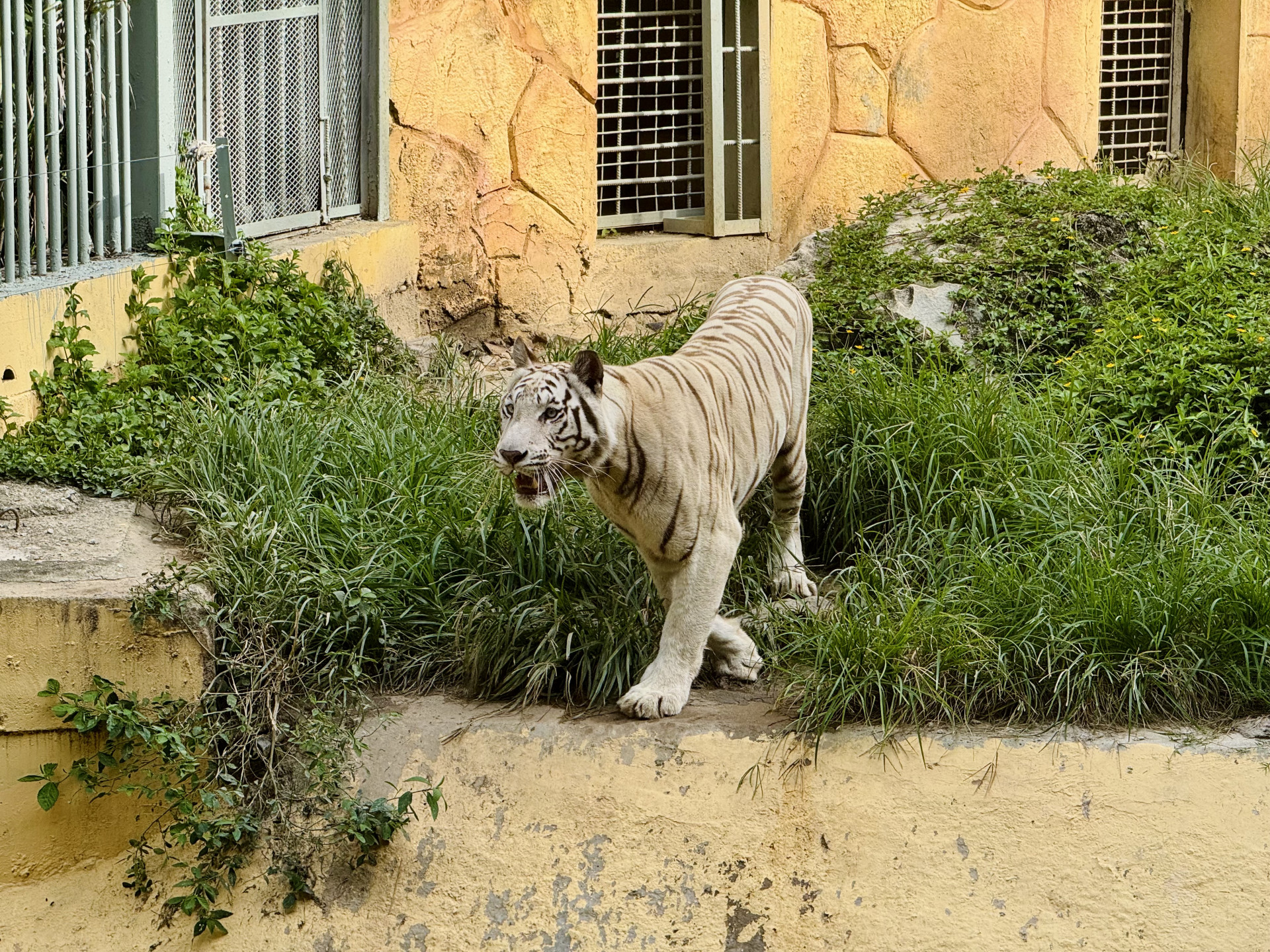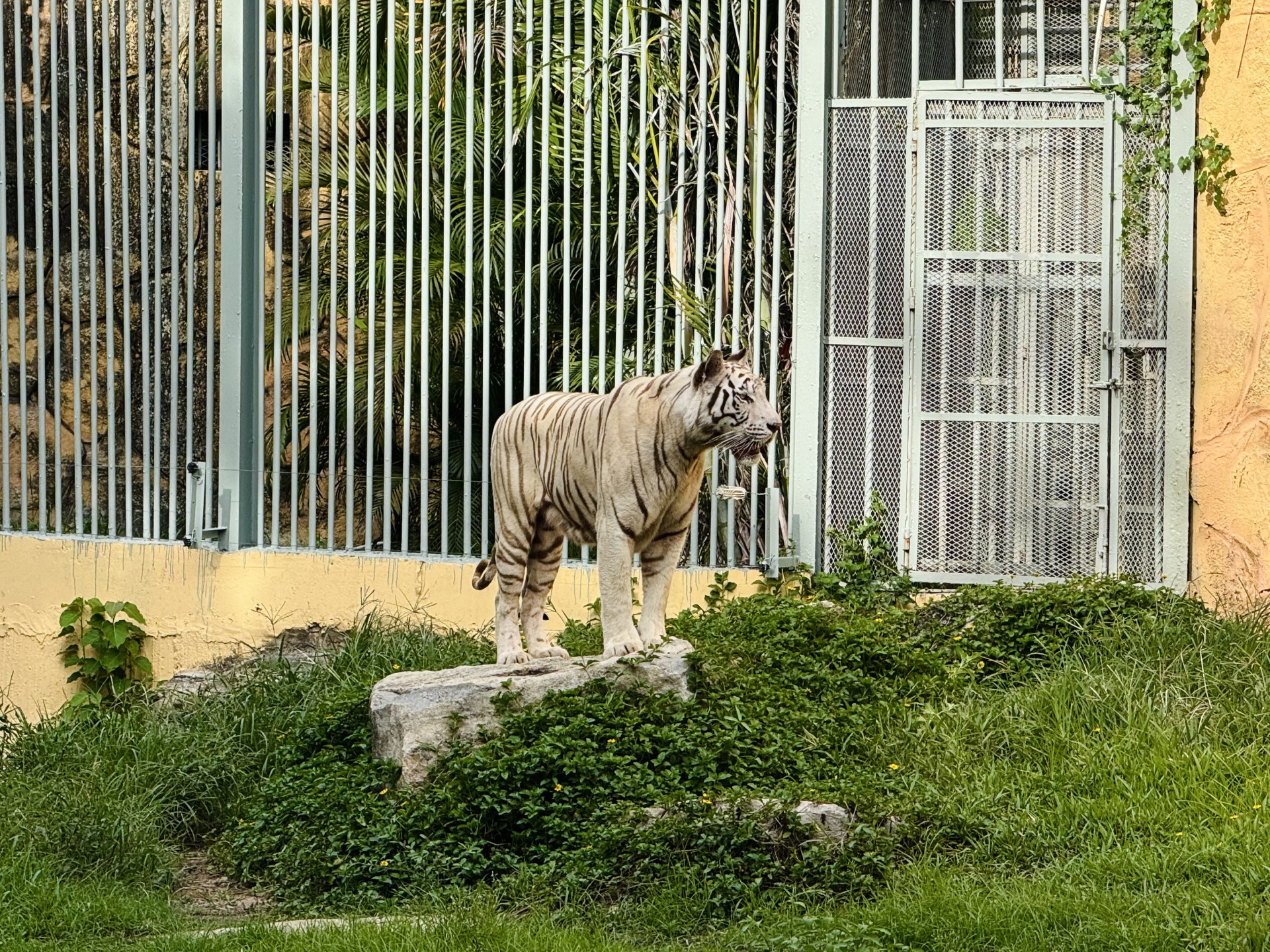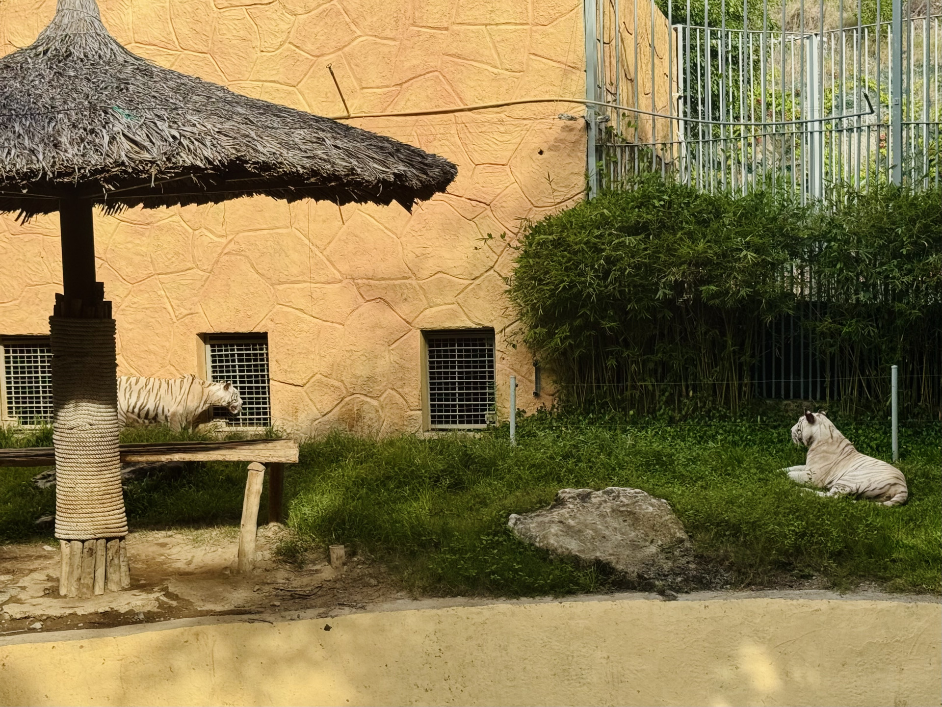 В зоопарке из интересного я видел двух белых тигров, вроде бы впервые в жизни. Это не отдельный вид, просто тигры с мутацией, но они встречаются крайне редко, здесь же их целых два. В одном вольере, но держались в основном порознь, поэтому я сделал только одно совместное фото.