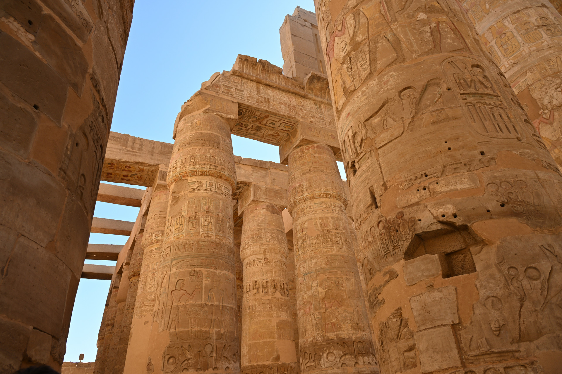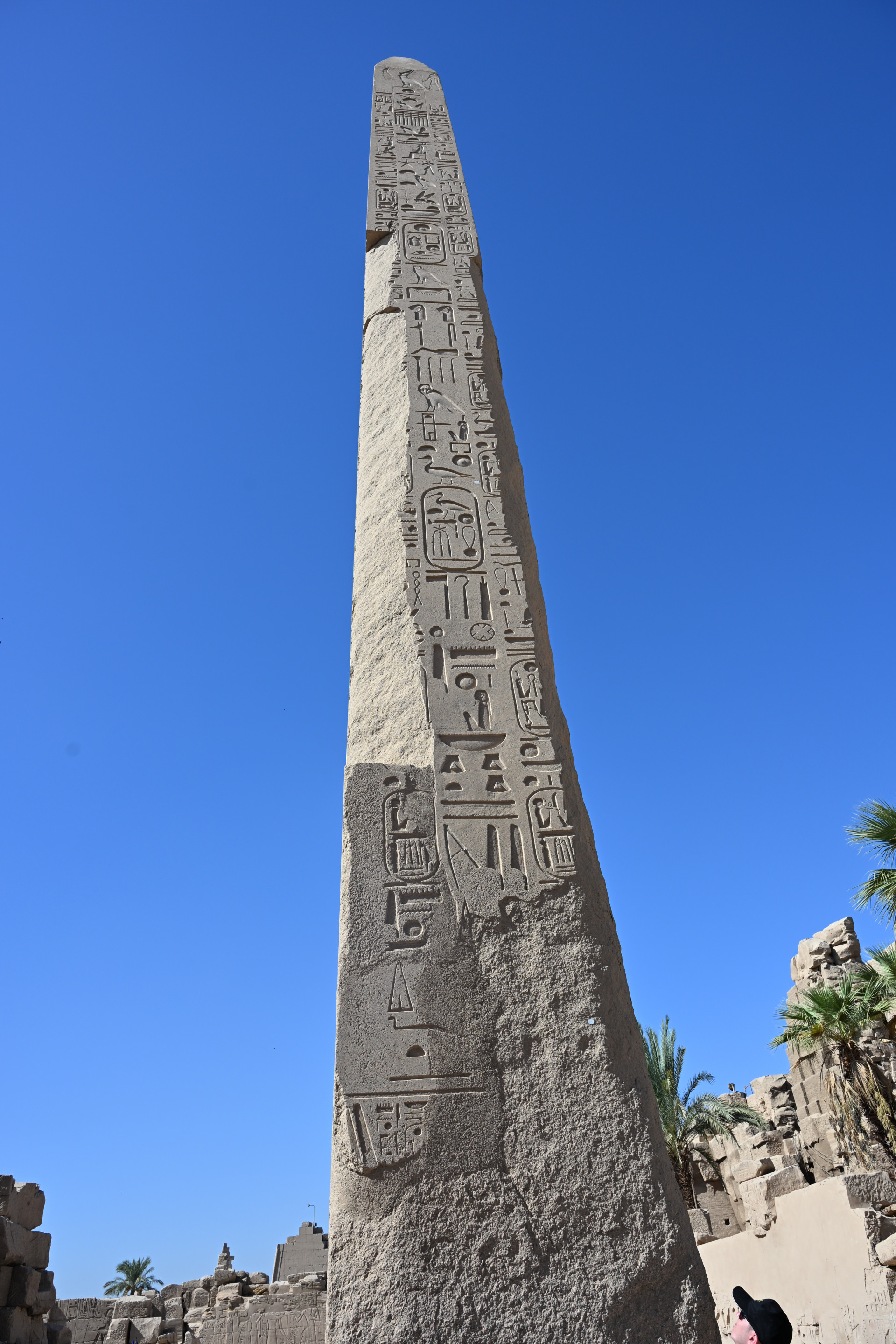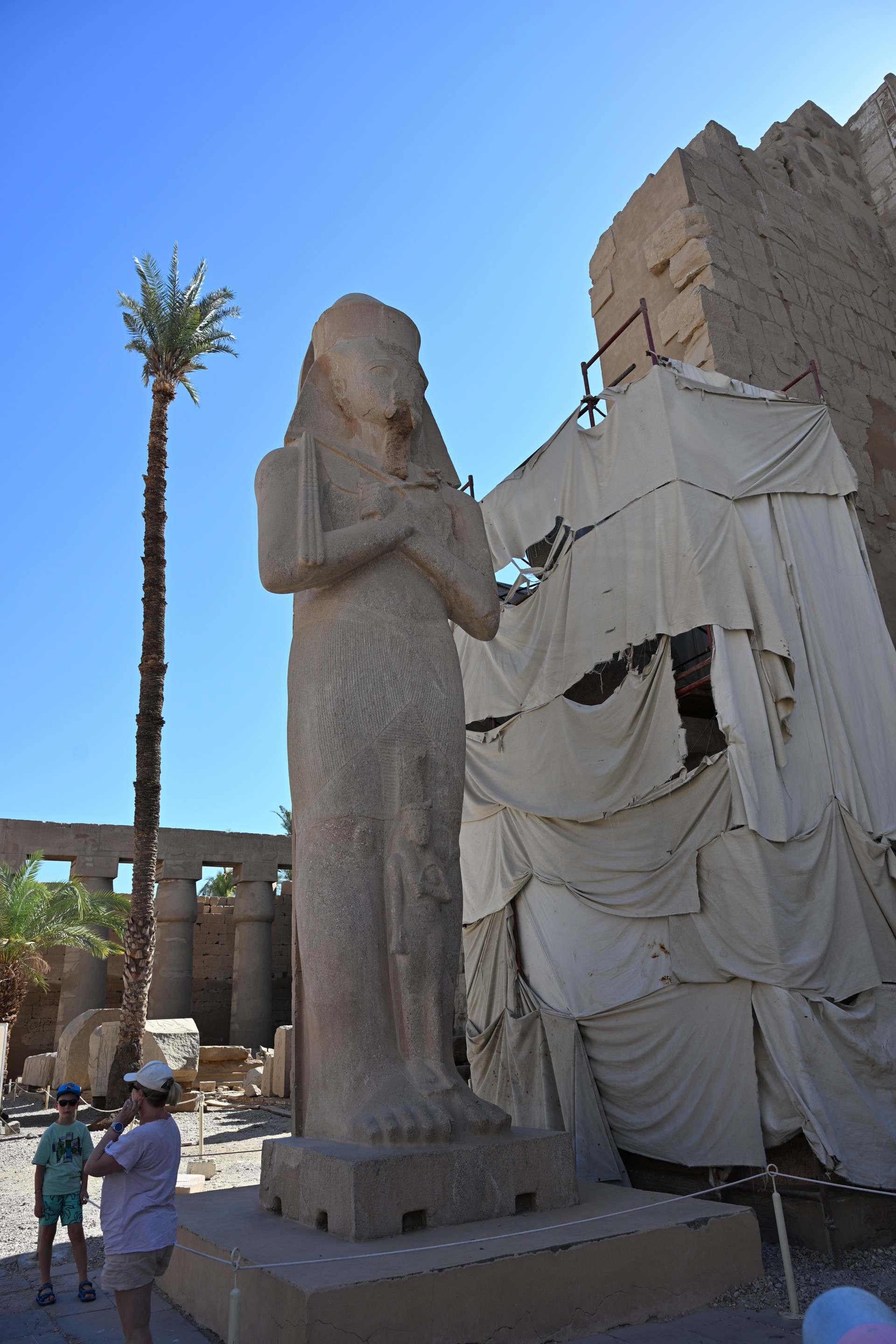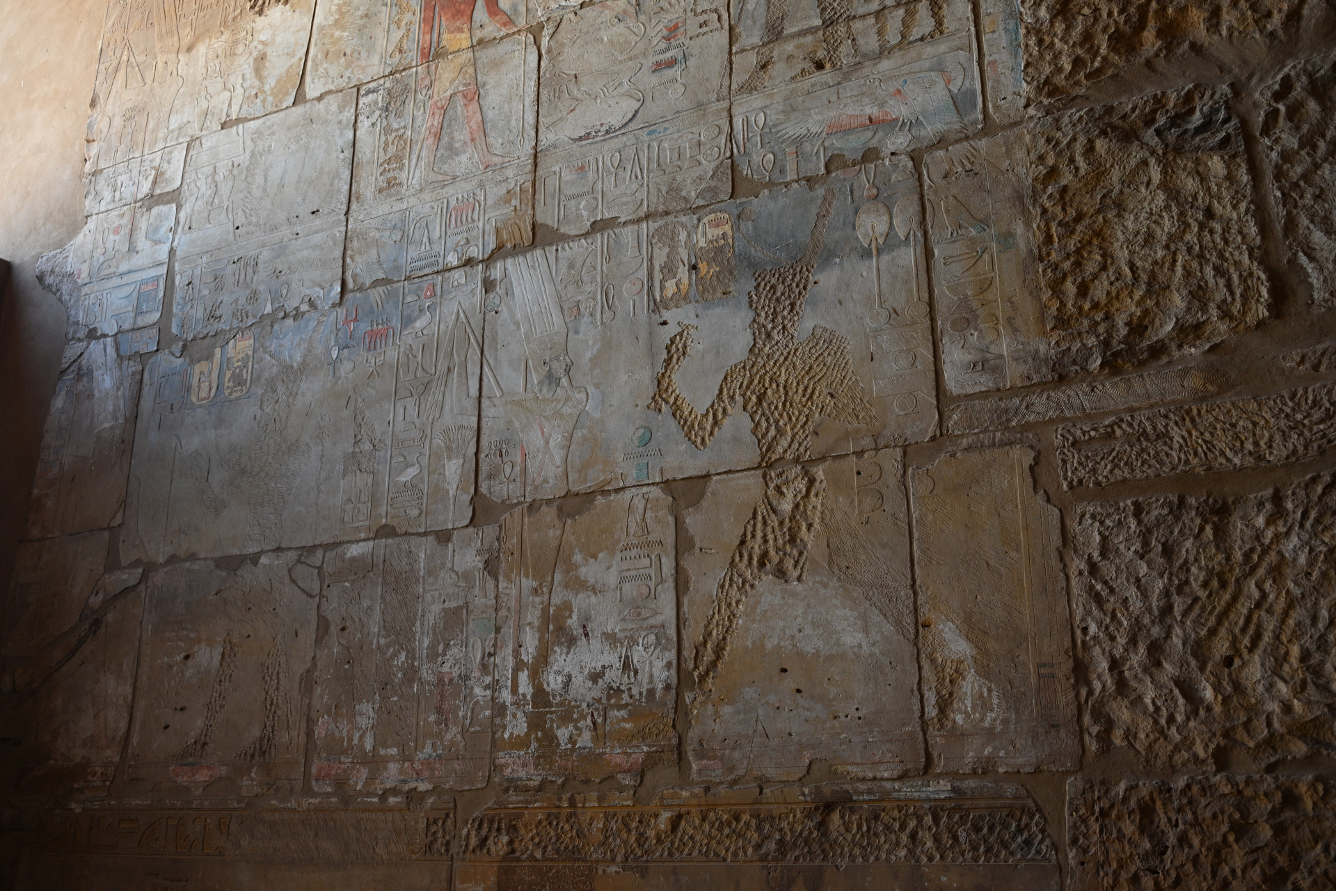Больше всего мне понравилась история о царице Хатшепсут, узурпировавшей власть, когда истинный наследник и её пасынок Тутмос III был слишком мал. Она не отдавала ему власть до самой своей смерти, а правление её было долгим и сопровождалось возведением множества построек с её изображениями. Женщина не могла быть фараоном, и потому, спустя несколько лет правления, она стала представляться в мужском роде и изображаться в виде мужчины, совсем как беоновцы. Когда она умерла, а Тутмос III наконец взошёл на трон, он был так обижен, что приказал уничтожить все до единого её изображения и упоминания её имени, коих было множество, в некоторых местах её имя он заменил своим. Ниже можно увидеть, что деструктированы изображения крайне искусно, не затронуто ничего, кроме самой Хатшепсут. По словам сопровождавшего нас египтолога, единственное сохранившееся изображение с ней находится в её собственном храме (в него мы заехали позже), его можно увидеть на третьем фото ниже на боковой стенке: то ли оно не было замечено, то ли это диверсия. Вот такая античная культура отмены. Вообще всё увиденное особенно интересно тем, насколько оно сохранно. В некоторых местах сохранились даже краски. Полагаю, изначально все изображения были выполнены в цвете.
