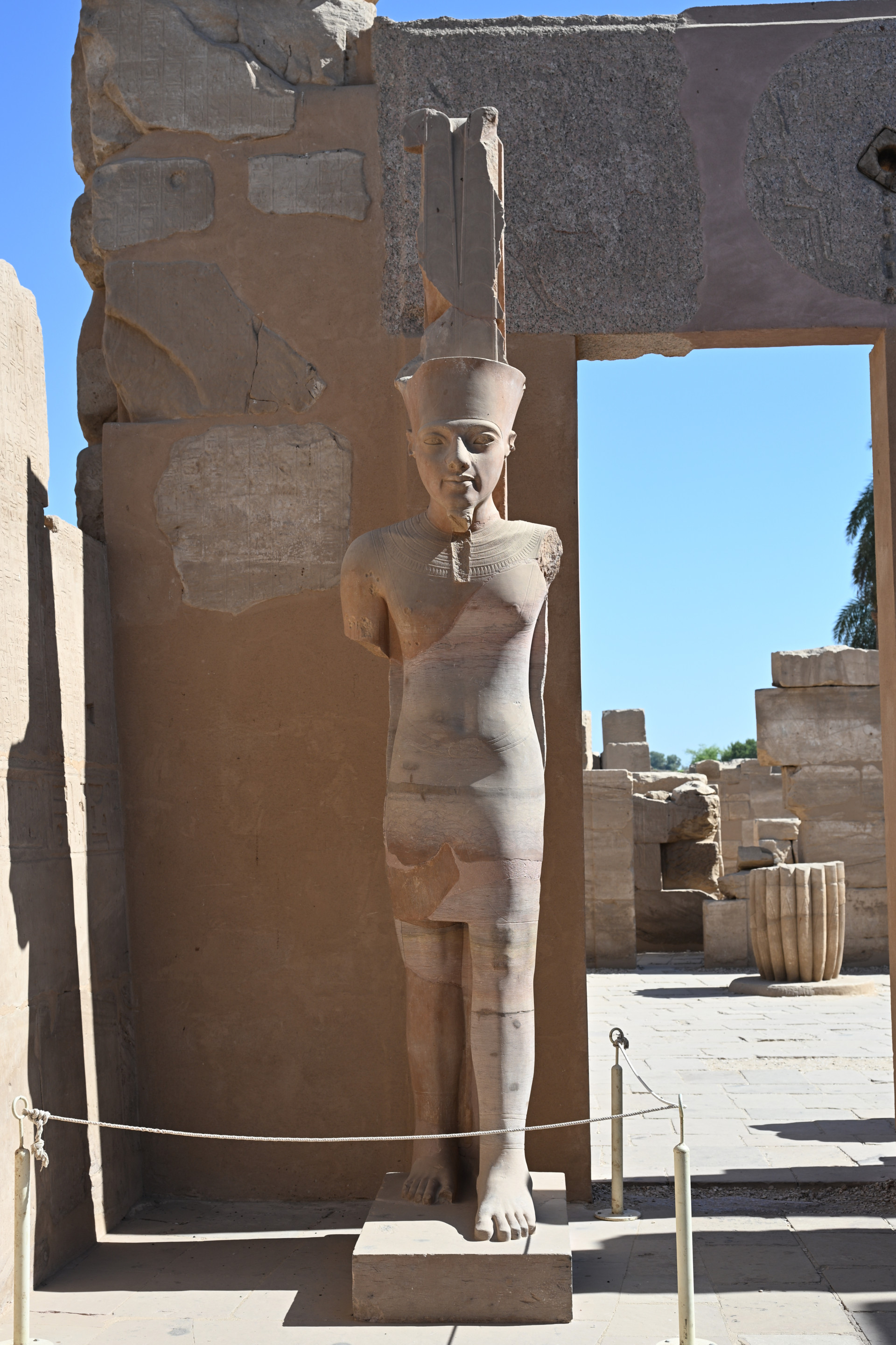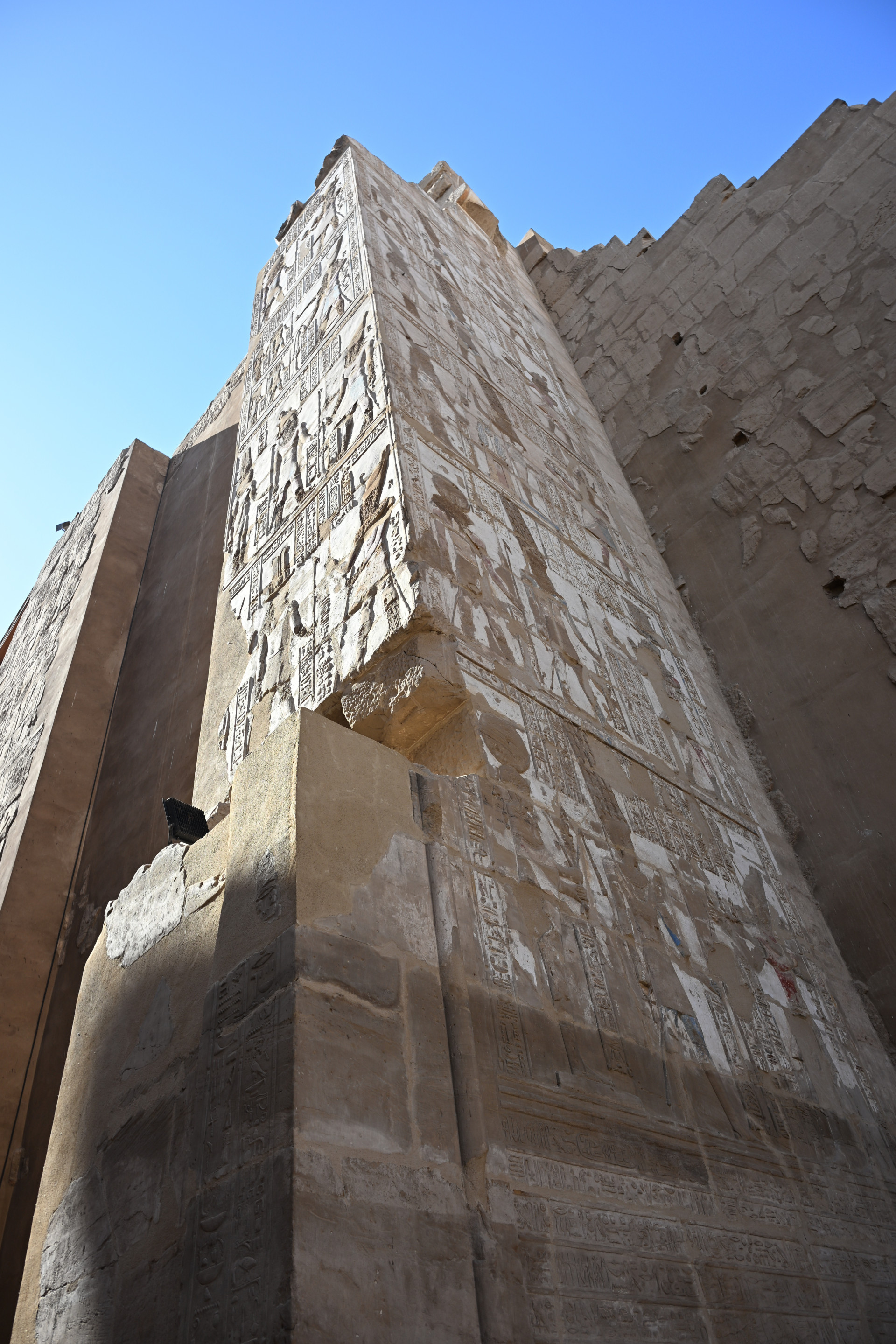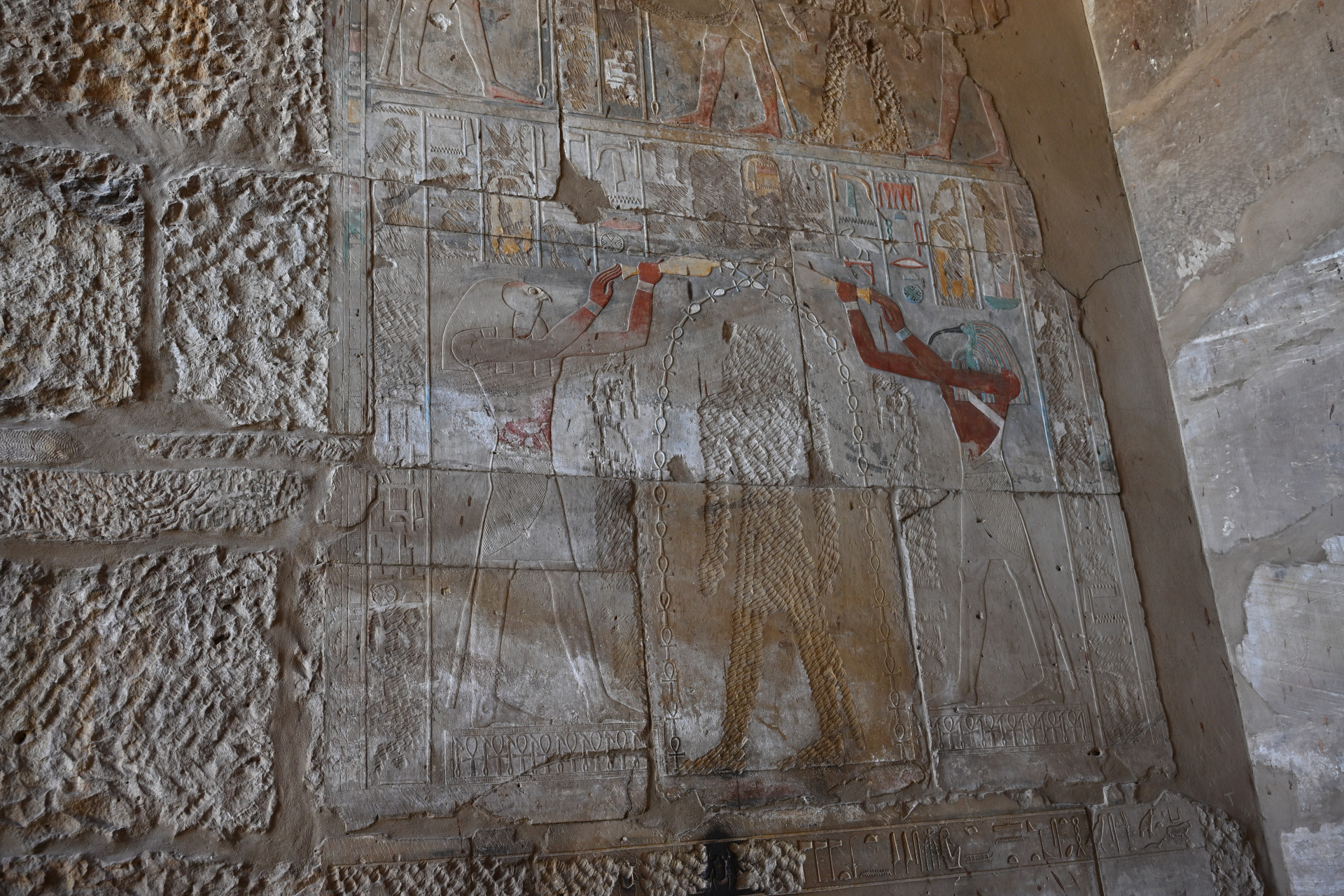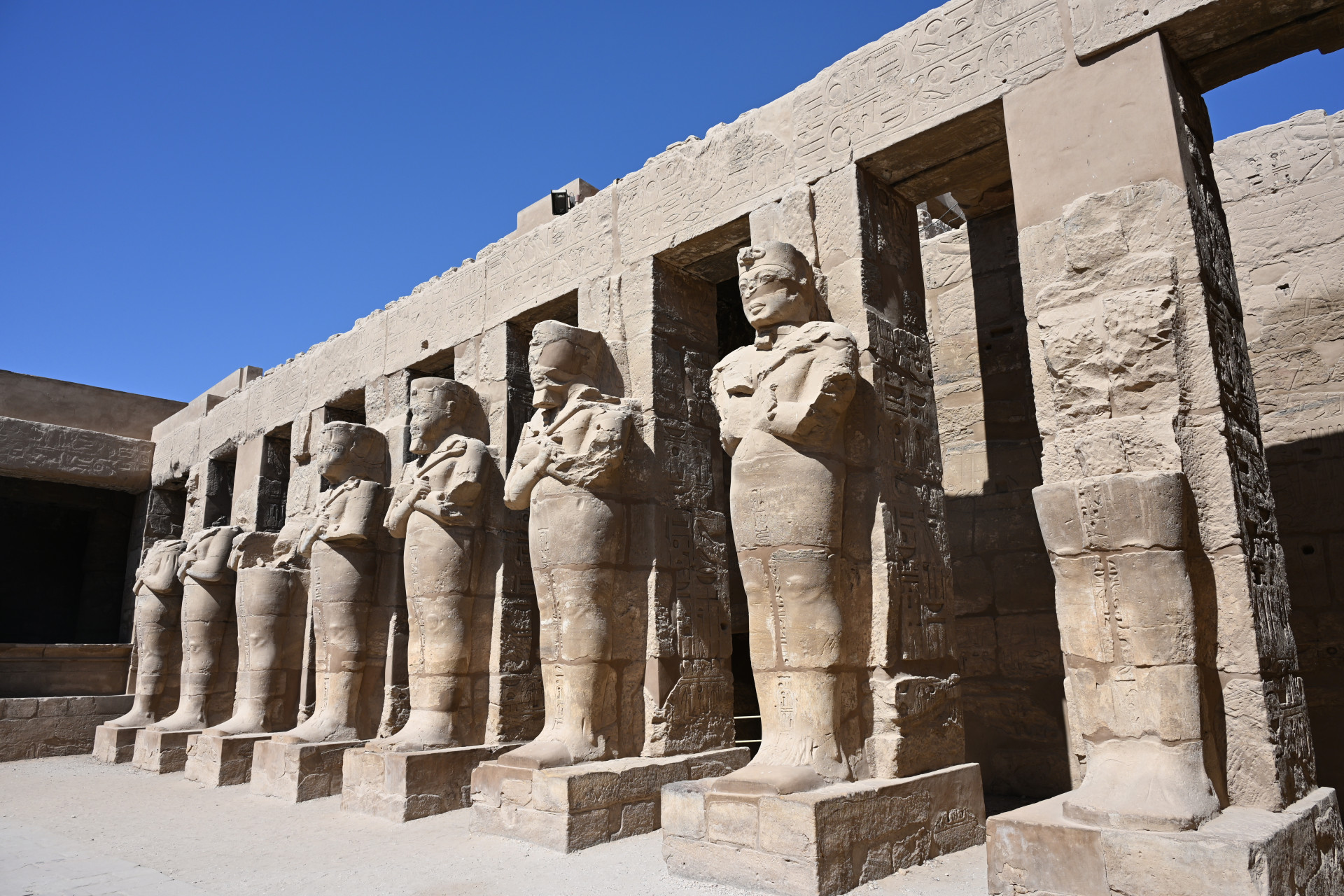 Больше всего мне понравилась история о царице Хатшепсут, узурпировавшей власть, когда истинный наследник и её пасынок Тутмос III был слишком мал. Она не отдавала ему власть до самой своей смерти, а правление её было долгим и сопровождалось возведением множества построек с её изображениями. Женщина не могла быть фараоном, и потому, спустя несколько лет правления, она стала представляться в мужском роде и изображаться в виде мужчины, совсем как беоновцы. Когда она умерла, а Тутмос III наконец взошёл на трон, он был так обижен, что приказал уничтожить все до единого её изображения и упоминания её имени, коих было множество, в некоторых местах её имя он заменил своим. Ниже можно увидеть, что деструктированы изображения крайне искусно, не затронуто ничего, кроме самой Хатшепсут. По словам сопровождавшего нас египтолога, единственное сохранившееся изображение с ней находится в её собственном храме (в него мы заехали позже), его можно увидеть на третьем фото ниже на боковой стенке: то ли оно не было замечено, то ли это диверсия. Вот такая античная культура отмены. Вообще всё увиденное особенно интересно тем, насколько оно сохранно. В некоторых местах сохранились даже краски. Полагаю, изначально все изображения были выполнены в цвете.